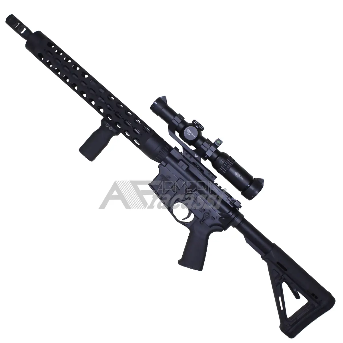 -corredata di:-Ottica Vortex StrikeEagle 1-6×24 con staffa monopezzo Vortex – Handguard JP Rapid Configuration. – Dissipatore di calore JP sulla canna – Freno di bocca JP – Calcio, impugnatura e vertical grip Magpul serie MOE System – Leve sicura ambi, leva armamento e sgancio caricatore maggiorati – Pin cane e grilletto anti slittamento